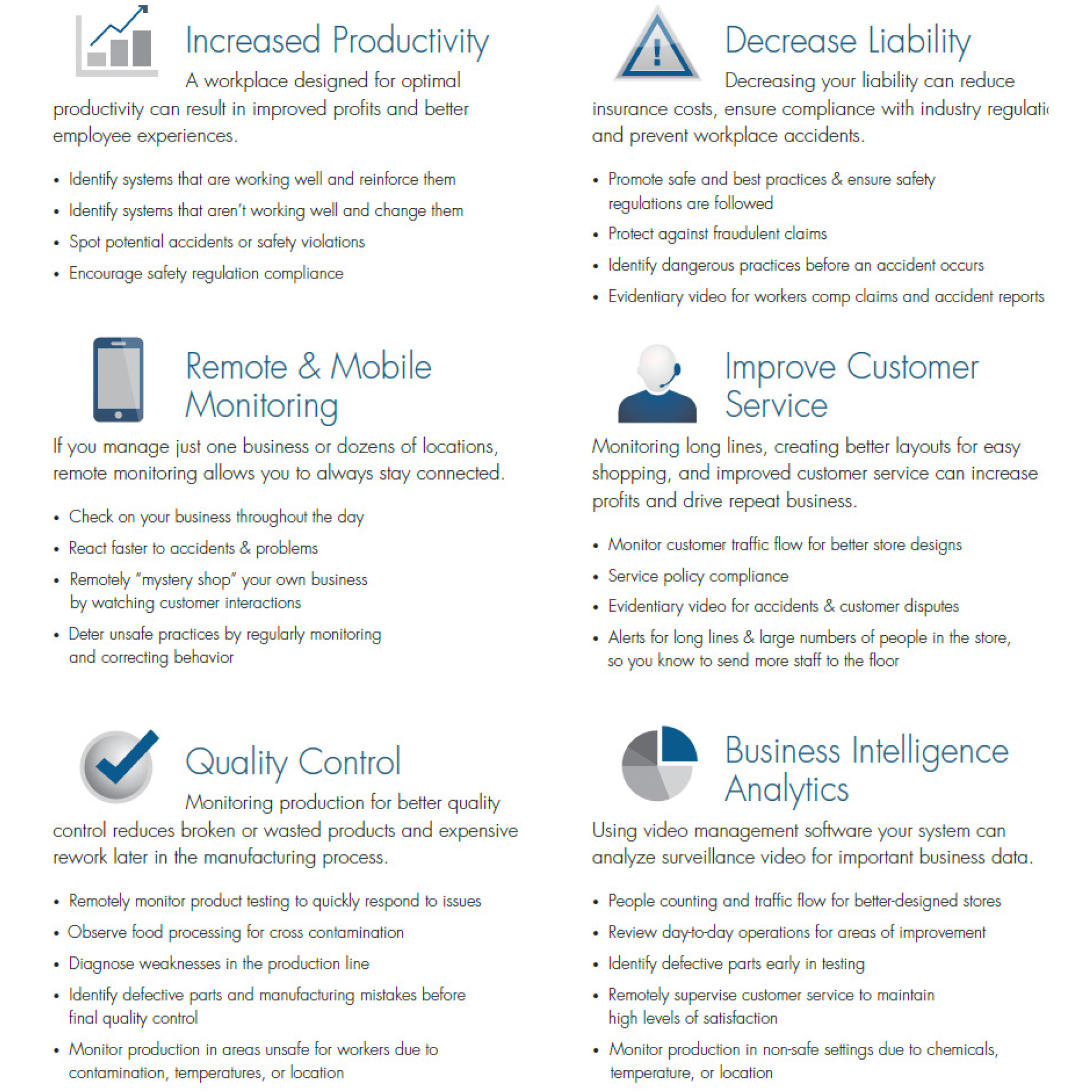 In terms of risk management, surveillance systems help to eliminate the threat of false claims and frivolous lawsuits. For most businesses, such scenarios often prove extremely costly. Video surveillance provides the necessary visual proof to confirm facts and address legitimate cases while refuting false ones.